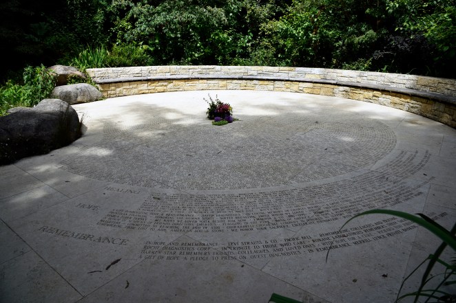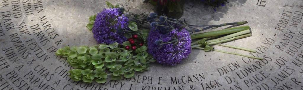 Floral arrangement at the center of a concrete circle. Long, tall Bells of Ireland with purple allium balls and red I-don’t-know-whats, tied together and placed thoughtfully, gently (or so I imagine her doing so – yes, it’s a her, I’m so sure of that — does that make me sexist?) in the center of rows and rows of words and names carved in outwardly radiating circular lines that go round and round this concrete plaza edged with a cement bench for those inclined to sit and ponder.