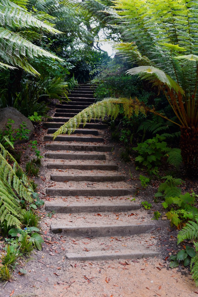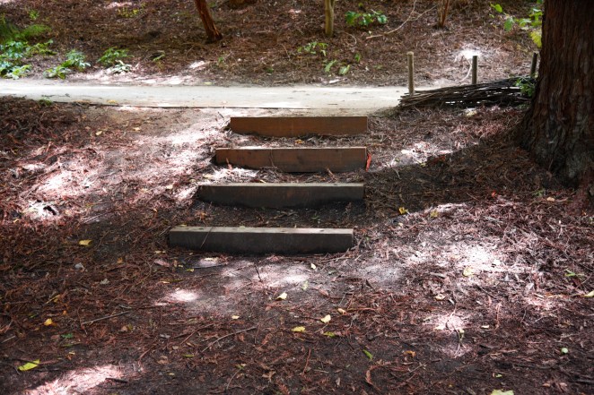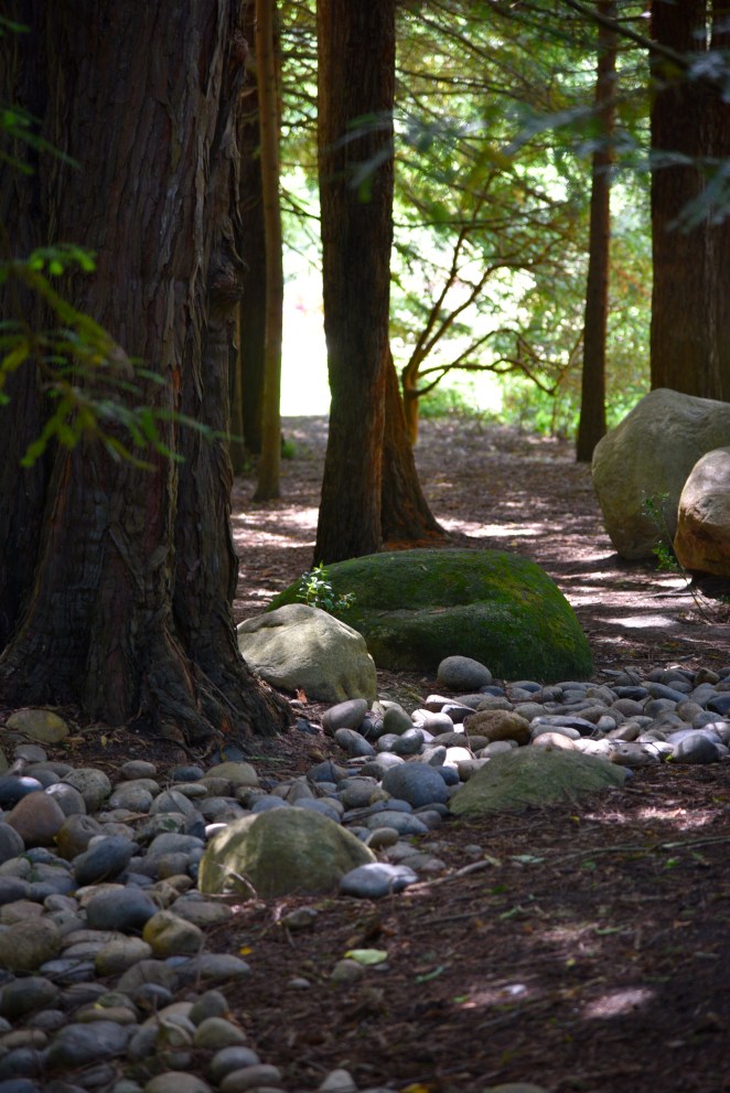 Eventually, I turn and place the circle behind me, moving forward into a deeply shaded grove of tall trees, whose nearest branches are far above me. In the generous spaces between these tree trunks I spy an undulating river of rocks that stretches on beyond a crest in the distance. On its “banks” I see large boulders here and there, accenting a curve in the “flow” of the dry, stony river that is composed of thoughtfully placed stones, ranging in sizes from baseball to melon.