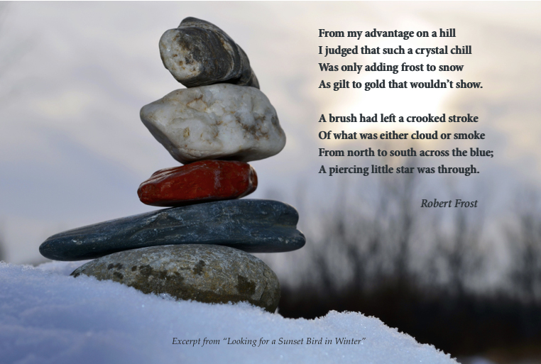 This image of the WayMaking Cairn (WMC) was taken in late January 2015, just a stone’s throw from the Little Calumet River. As I’ve menioned in earlier posts, the WMC is one of many images in a subset of my contemplative photography work. It serves as an avatar-like manifestation of my spiritual engagement with my surroundings as I walk. In anthropological terms it serves as participant-observer in the environment where the shot was made. The excerpt from Robert Frost”s poem “Looking for a Sunset Bird in Winter” created a rich dialogical exchange between the image and the text.