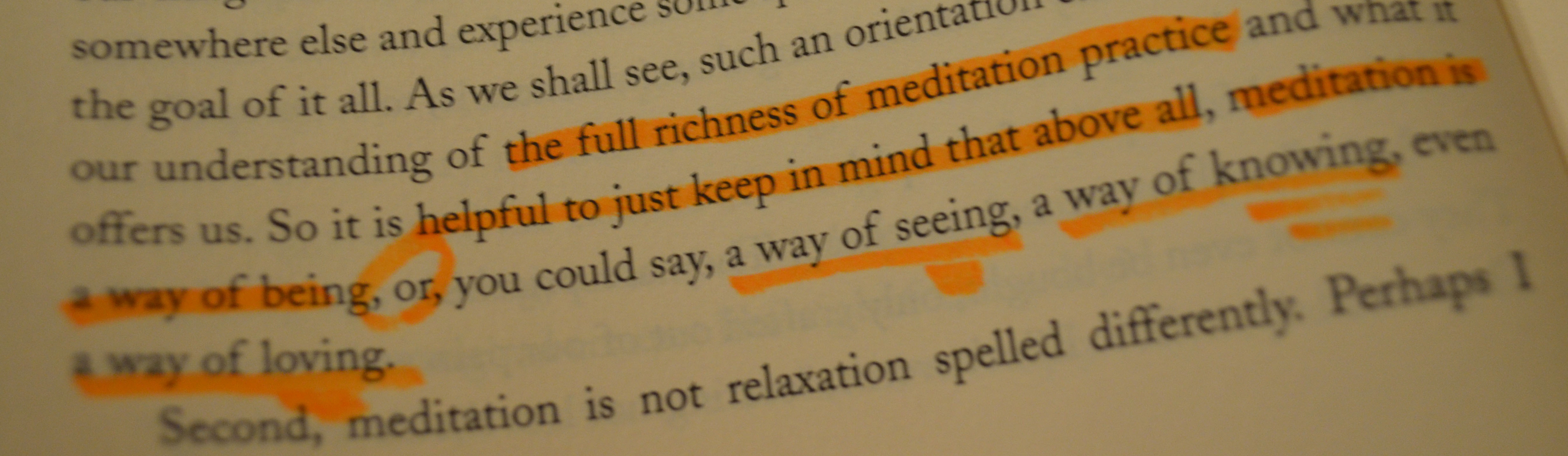 Lately, I’ve been going back and forth between two books which have been very helpful in helping me articulate the connection I’ve been experiencing between the mindfulness of meditation and the mindfulness of my art practice. They are Jon Kabat-Zinn’s book Coming to Our Senses – Healing Ourselves and the World Through Mindfulness (c) 2005 Hyperion Books and Buddha Mind in Contemporary Art, edited by Jacquelynn Braass and Mary Jane Jacob (c) 2004, University of California Press.