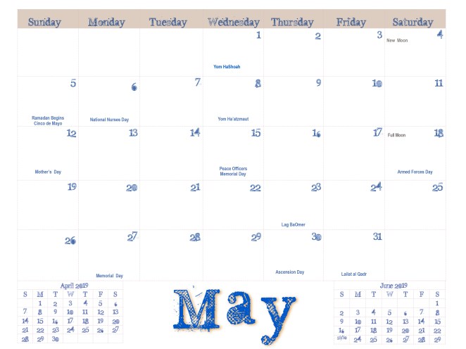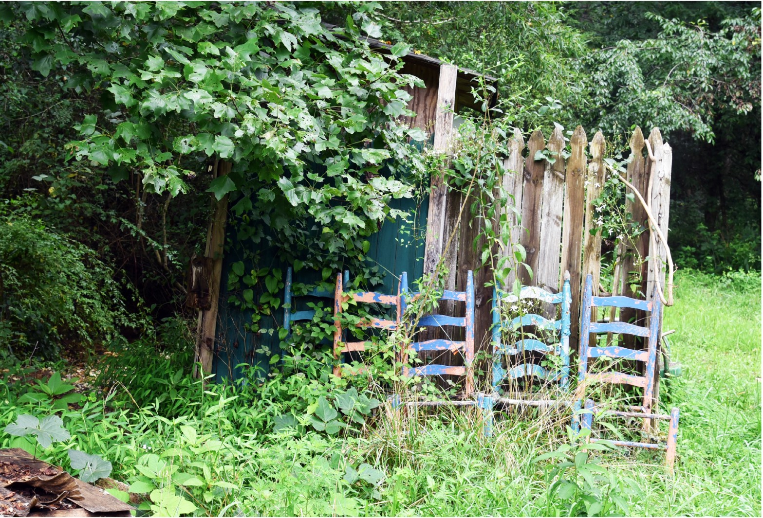 Welcome to the May 2019 calendar pages. This image was taken in Asheville, North Carolina a few years back when I began exploring a unique intentional community in that area. One of the properties that the community continues to consider how to rejuvenate includes a farm tract, trailer residences, and a large area where, in years past, folks have dumped old cars, thresher wheels, furniture, motorcycles, concrete mixers and more. A couple of tradesman had set up shop there too. In the midst of this polyglot of sights and possibilities was this very old, partially overgrown outhouse, and these whimsically placed chairs in a row on one side. I immediately imagined the chairs being there for those waiting in line to use the facility, and “Queuing for the Loo” became this image’s title. I was especially pleased to find a font for the calendar page that somehow echoes the feel of the old outhouse and aging chairs with peeling paint.